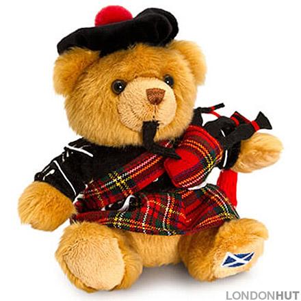 This Scottish piper teddy bear looks absolutely stunning in his tartan kilt, tall bearskin hat and comes complete with bagpipes. This soft toy measures 15cm when seated and has the St Andrews Saltire flag embroidered on one foot. It is made using the finest materials and in compliance with all European Safety Standards. This teddy bear makes an ideal souvenir from Scotland.